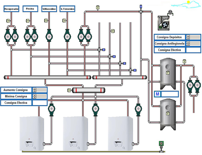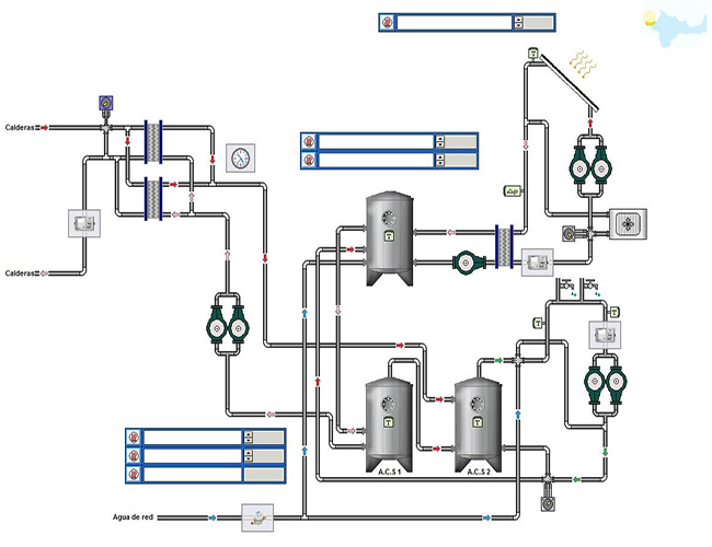A continuación, mostraremos algunos de los diseños que realizamos para la visualización de la instalación para nuestros clientes. Diseñamos y programamos todo tipo de control de edificios e instalaciones como salas de calderas, laboratorios, quirófanos, hospitales, barcos, invernaderos, etc. Estás imágenes son diseñadas integramente por Aplirecon, por lo tanto solo nosotros podemos hacer uso de ellas.